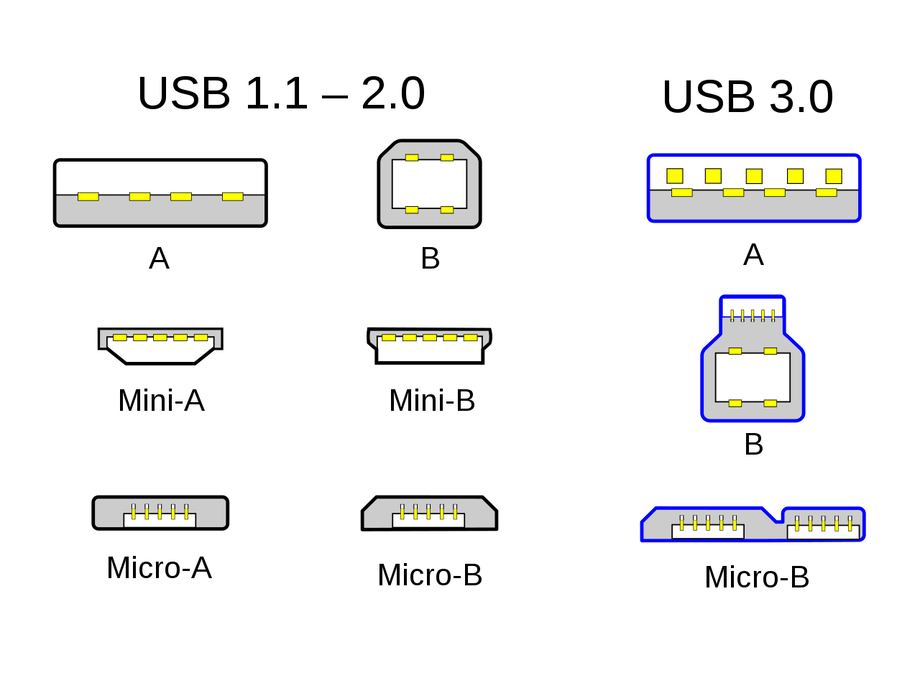 A continuación puedes ver un gráfico de los perfiles de los conectores USB según la versión, estos son los llamados Tipo A para los planos y B para los más cuadrados.